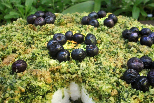 Z ciasta odcinam wierzch i kruszę go na drobinki. Na pozostałą część ciasta nakładam ubitą masę śmietanową. Wierzch zdobię okruszkami, dociskam je lekko, a na nich umieszczam dowolną ilość jagód albo innych leśnych owoców.